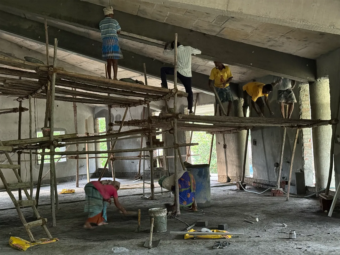 Construction continues at Hridaya Kshetram Satsang Hall. A complicated roof being poured on one of the separate buildings of the project.
