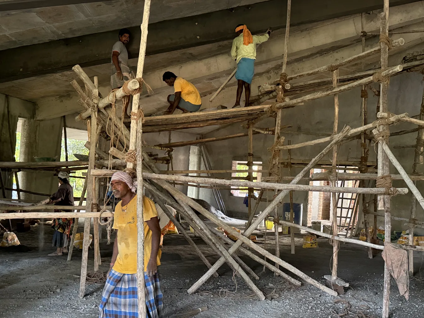 New satsang hall construction. The full form takes shape as complex centering work is prepared for pouring the roof slab.