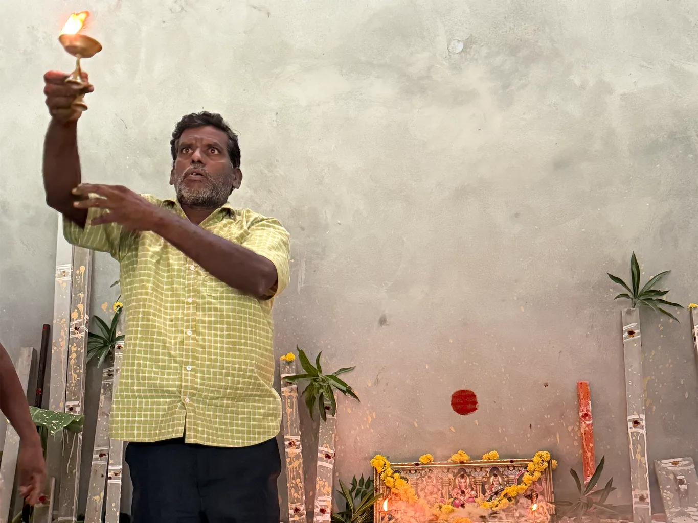 As part of morning preparations for satsang, deepam being offered at the altar in the ashram.